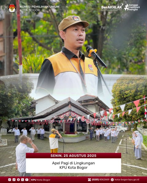 Senin pagi, jajaran KPU Kota Bogor melaksanakan apel rutin di halaman kantor. Ketua Divisi Hukum dan Pengawasan, Dede Juhendi, S.E., bertindak sebagai pembina apel.