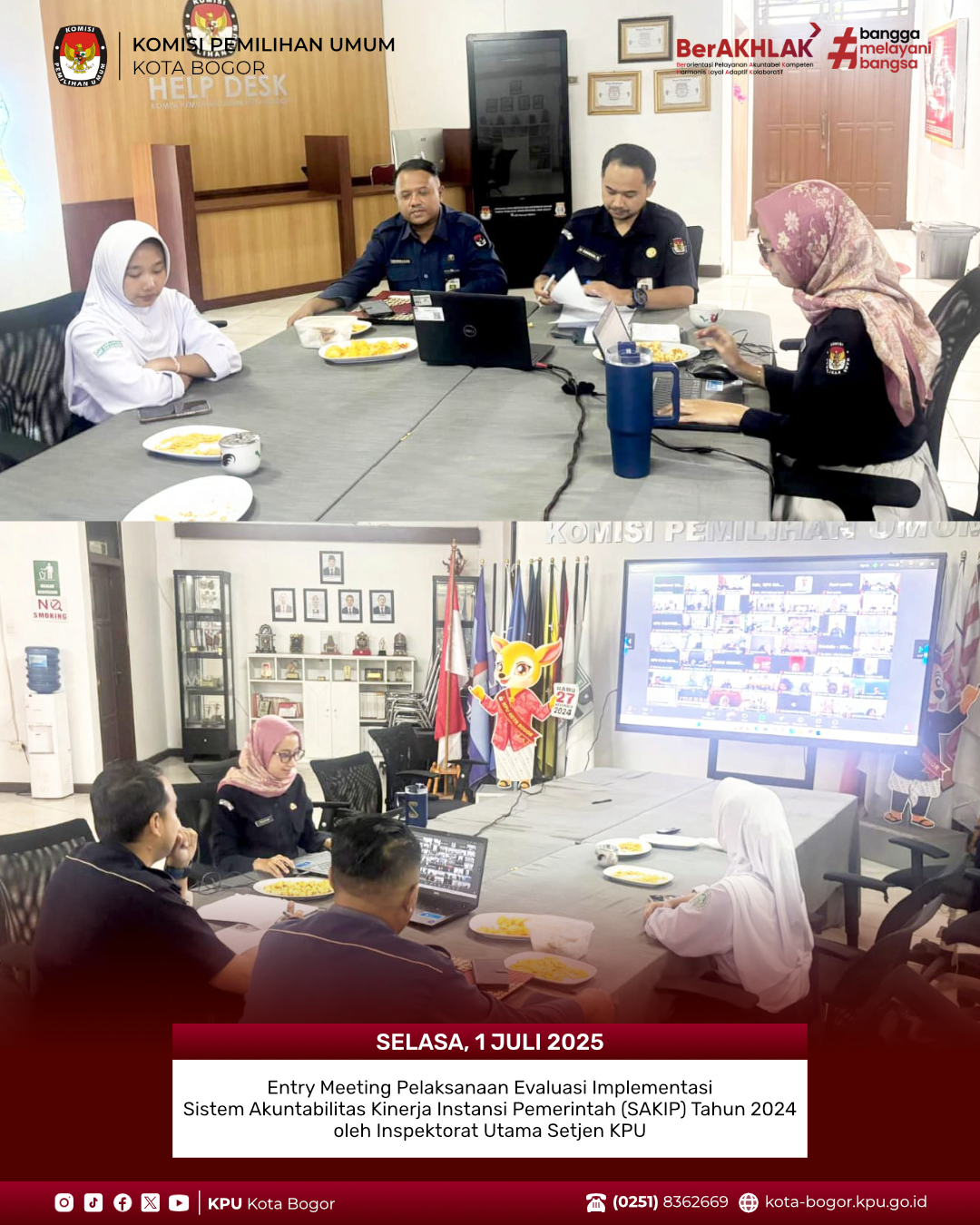 KPU Kota Bogor mengikuti Entry Meeting Pelaksanaan Evaluasi Implementasi Sistem Akuntabilitas Kinerja Instansi Pemerintah (SAKIP) Tahun 2024 yang diselenggarakan oleh Inspektorat Utama Sekretariat Jenderal KPU RI.
