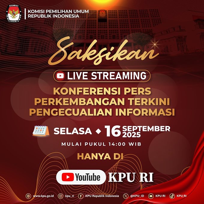 saksikan Live Streaming Konferensi Pers Perkembangan Terkini Pengecualian Informasi hari Selasa, 16 September 2025 mulai pukul 14.00 WIB. Hanya di kanal Youtube KPU.