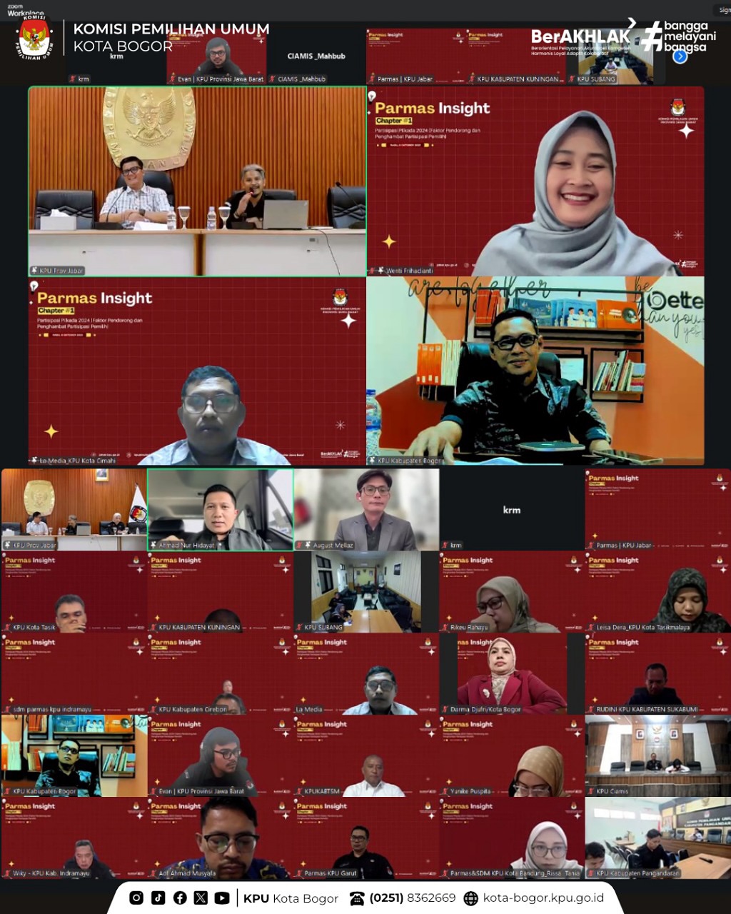KPU Kota Bogor mengikuti kegiatan Parmas Insight Chapter #1 yang diselenggarakan oleh KPU Provinsi Jawa Barat dengan tema “Partisipasi Pilkada 2024: Faktor Pendorong dan Penghambat Partisipasi Pemilih”, secara daring melalui Zoom Meeting, Rabu (8/10).