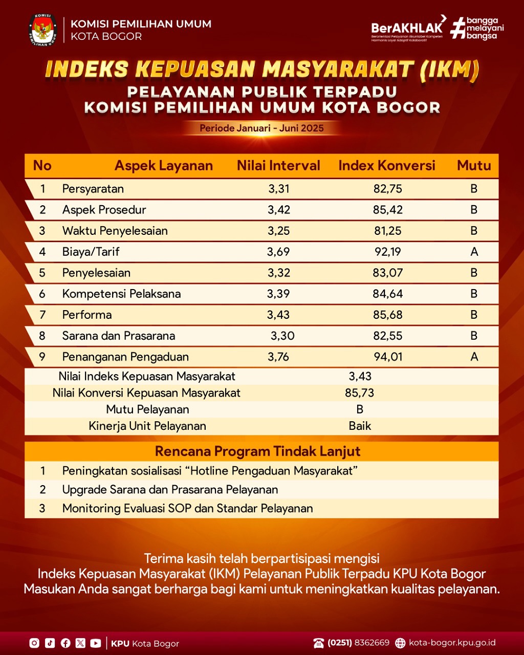 Hasil survei indeks kepuasan masyarakat terhadap pelayanan publik terpadu KPU Kota Bogor menunjukkan angka 85.73, yang berarti BAIK! ????