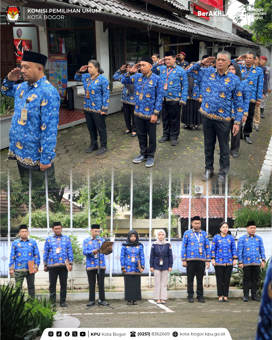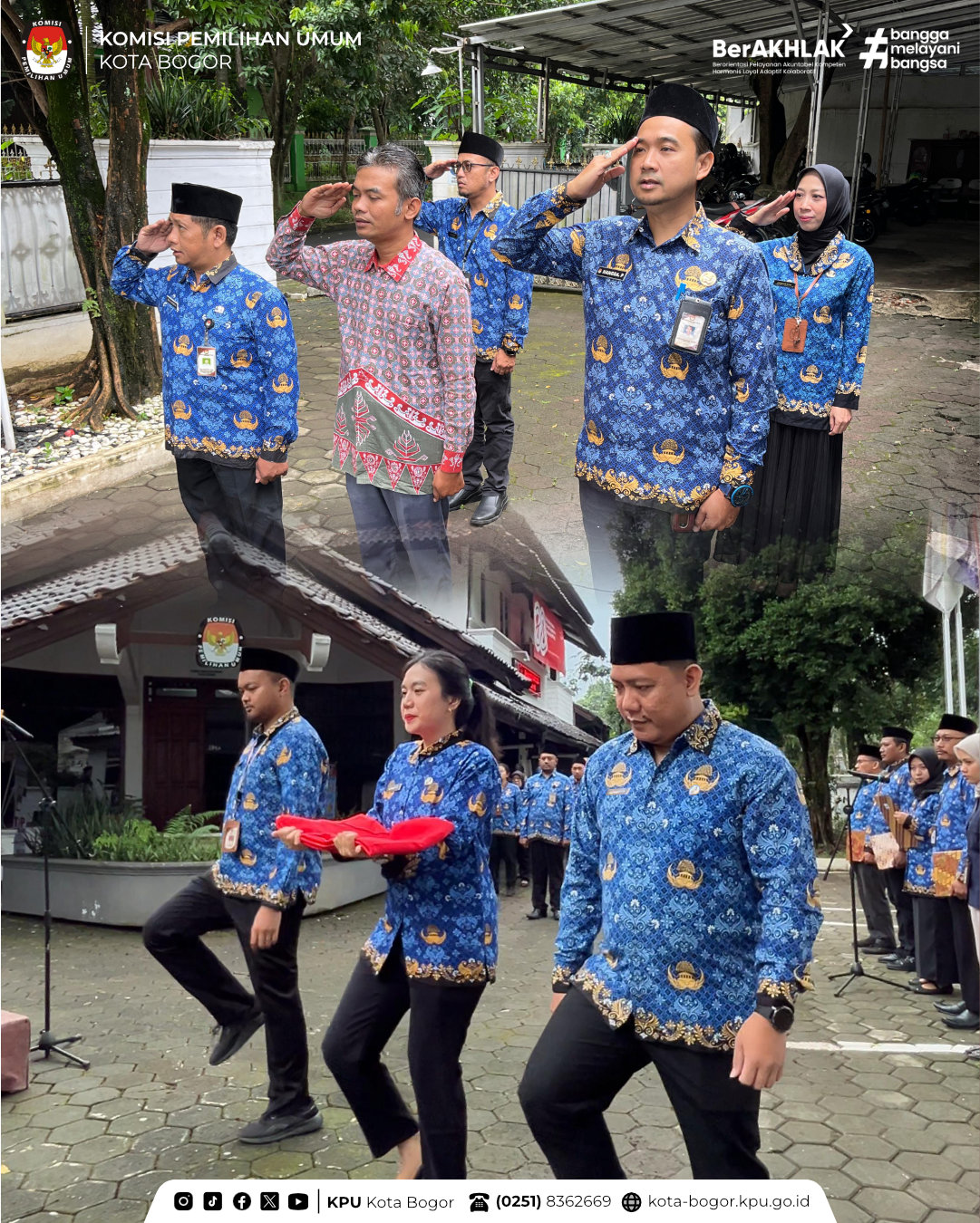 Upacara dipimpin oleh Pembina Upacara Ketua KPU Kota Bogor Muhammad Habibie Zaenal Arifin, S.Pd.I., S.E., dan Pemimpin Upacara Kepala Sub Bagian Perencanaan Data dan Informasi Dindin Herdian, S.I.A., M.I.Pol.