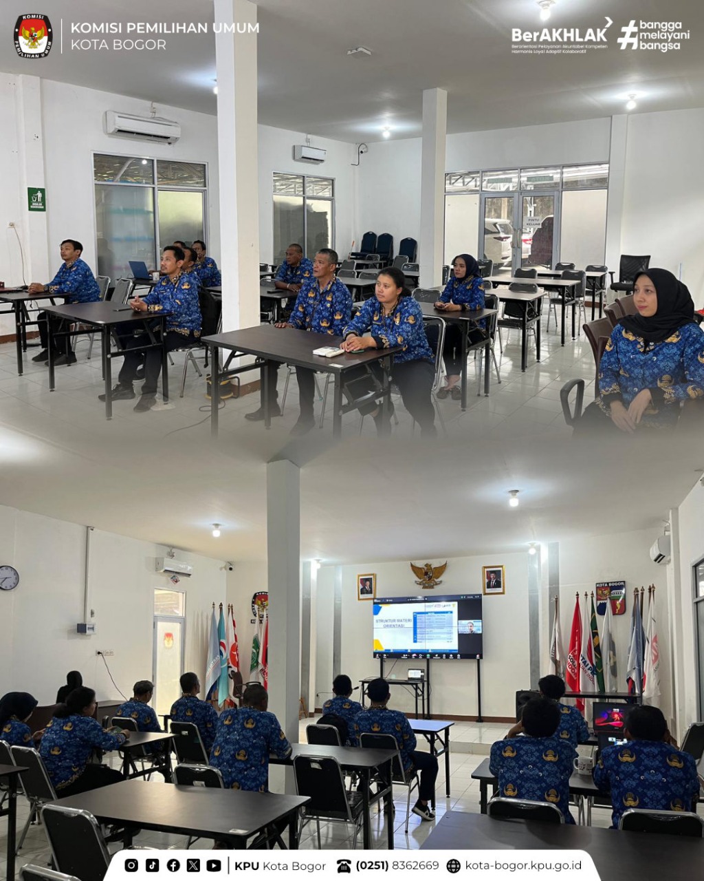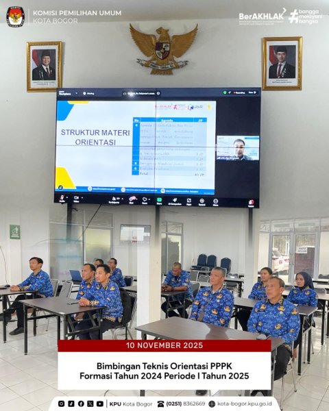 KOTA BOGOR – Komisi Pemilihan Umum (KPU) Kota Bogor mengikuti Bimbingan Teknis Orientasi PPPK Formasi Tahun 2024 Periode I Tahun 2025, Senin (10/11/2025). Kegiatan yang diinisiasi oleh Biro Sumber Daya Manusia (SDM) Sekretariat Jenderal KPU RI ini dilaksanakan di Aula Kantor KPU Kota Bogor.