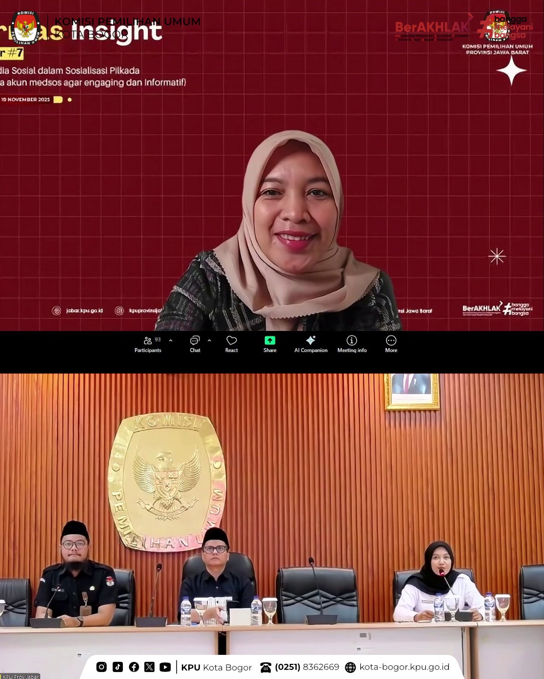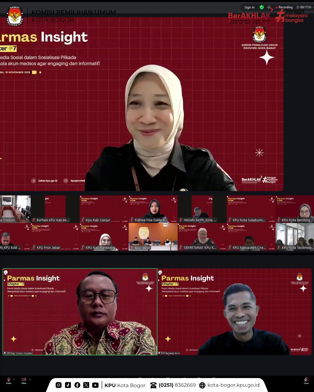 KOTA BOGOR – Komisi Pemilihan Umum (KPU) Kota Bogor mengikuti kegiatan Parmas Insight Chapter #7 yang mengangkat tema “Peran Media Sosial dalam Sosialisasi Pilkada: Mengelola Akun Medsos agar Engaging dan Informatif.” Kegiatan ini menjadi ruang pembelajaran dan penguatan strategi komunikasi publik bagi jajaran KPU pasca Pemilu dan Pemilihan serentak.