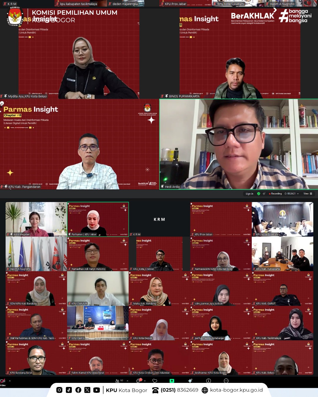 KOTA BOGOR – Komisi Pemilihan Umum (KPU) Kota Bogor mengikuti kegiatan Parmas Insight Chapter #8 melalui Zoom Meeting yang mengangkat tema “Melawan Hoaks dan Disinformasi Pilkada: Literasi Digital untuk Pemilih”, Rabu 26/11. Kegiatan dipandu oleh Kasubag Parhumas dan SDM KPU Kota Bogor, Mydita Puspa Ayu, S.H., M.H, serta dibuka secara resmi oleh Ketua Divisi Parhumas KPU Provinsi Jawa Barat, Hedi Ardia, S.Pd.I., M.A.P. Tema ini menjadi salah satu langkah strategis KPU dalam memperkuat pemahaman publik mengenai pentingnya informasi yang benar dan akurat pada tahapan Pemilu dan Pemilihan mendatang.