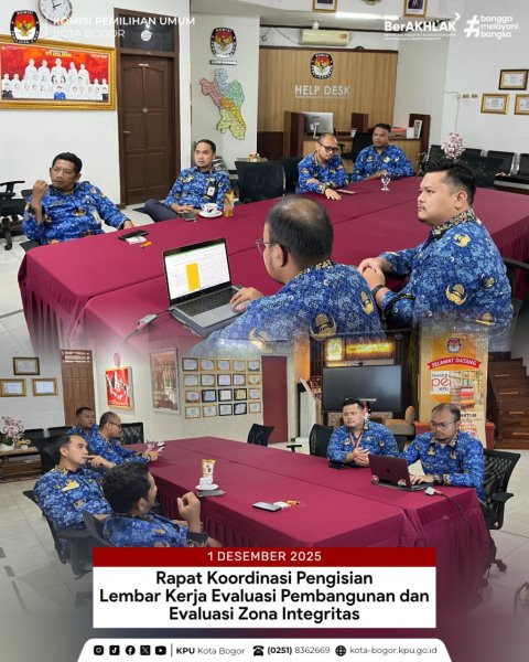 KOTA BOGOR – Komisi Pemilihan Umum (KPU) Kota Bogor melakasanakan Rapat Koordinasi terkait pengisian Lembar Kerja Evaluasi Pembangunan dan Evaluasi Zona Integritas sebagai bagian dari upaya peningkatan tata kelola kelembagaan 01/12. Rakor yang dilaksanakn di Aula Kantor KPU Kota Bogor ini diikuti oleh Sekretaris dan Seluruh Kasubag dan tim teknis yang terlibat dalam penyusunan dokumen Zona Integritas. PSekretaris KPU Kota Bogor Hangga Pramaditya, S.H.,M.H menjadi pemimpin jalannya rapat
