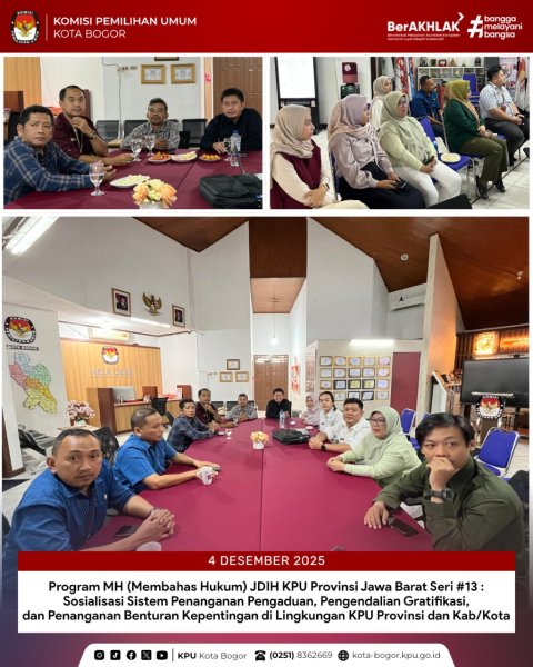 Kota Bogor - Divisi Hukum dan Pengawasan Komisi Pemilihan Umum (KPU) Kota Bogor mengikuti kegiatan Program MH (Membahas Hukum) JDIH KPU Provinsi Jawa Barat Seri #13 mengenai Sosialisasi Sistem Penanganan Pengaduan, Pengendalian Gratifikasi, dan Penanganan Benturan Kepentingan di Lingkungan KPU Provinsi dan Kab/Kota, Kamis 04/12. Ketua Divisi Teknis Penyelenggaraan Pemilu Dian A Yamin beserta Ketua Divisi Hukum dan Pengawasan Dede Juhendi, SE serta Sekretaris KPU Kota Bogor Hangga Pramaditya, S.H.,M.H juga jajaran terkait turut hadir pada kegiatan yang diselenggarakan secara daring ini. Tema mengenai Pedoman Teknis Pembentukan Keputusan ini memaparkan terkait mekanisme pelaporan pengaduan masyarakat, prosedur tindak lanjut penanganan gratifikasi, serta langkah antisipasi atas potensi benturan kepentingan dalam tugas penyelenggara Pemilu. Narasumber menekankan pentingnya integritas dan etika bagi seluruh pegawai sekaligus memberikan pemahaman terkait regulasi terbaru yang harus dipedomani dalam pelaksanaan tugas. Melalui kegiatan ini, diharapkan setiap satuan kerja di lingkungan KPU mampu mengoptimalkan peran pengawasan internal serta memperkuat budaya organisasi yang bebas dari praktik korupsi. KPU juga mendorong seluruh peserta untuk aktif mensosialisasikan kembali materi yang diperoleh kepada jajaran di Satker masing-masing.