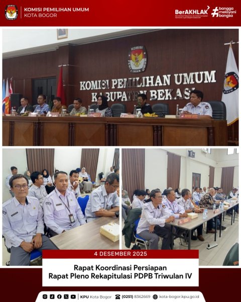 Kota Bogor - Kepala Subbagian Perencanaan data dan informasi DIndin Herdian, S.I.A.,M.I.Pol beserta operator data, menghadiri undangan rapat koordiansi persiapan rapat pleno rekapitulasi PDPB Triwulan IV, Kamis 04/12. Ketua Divisi Data dan Informasi Ummi Wahyuni menjadi narasumber pada kegiatan yang diselenggarakan di Aula Kantor KPU Kabupaten Bekasi, Jl. Raya Rengas Bandung No.103. Rapat koordinasi ini membahas terkait teknis kelengkapan data, dan strategi pelaksanaan pleno agar proses rekapitulasi PDPB dapat berjalan akurat, transparan, dan sesuai ketentuan yang berlaku. Selain itu, peserta rapat juga melakukan evaluasi terhadap hasil pengolahan data sebelumnya.