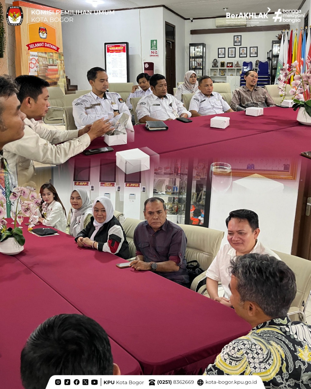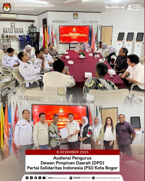 Kota Bogor — Komisi Pemilihan Umum (KPU) Kota Bogor, menerima audiensi pengurus Dewan Pimpinan Daerah (DPD) Partai Solidaritas Indonesia (PSI) Kota Bogor, pada Senin, 08/12, di Aula Kantor KPU Kota Bogor, Jl. Senam No. 12.