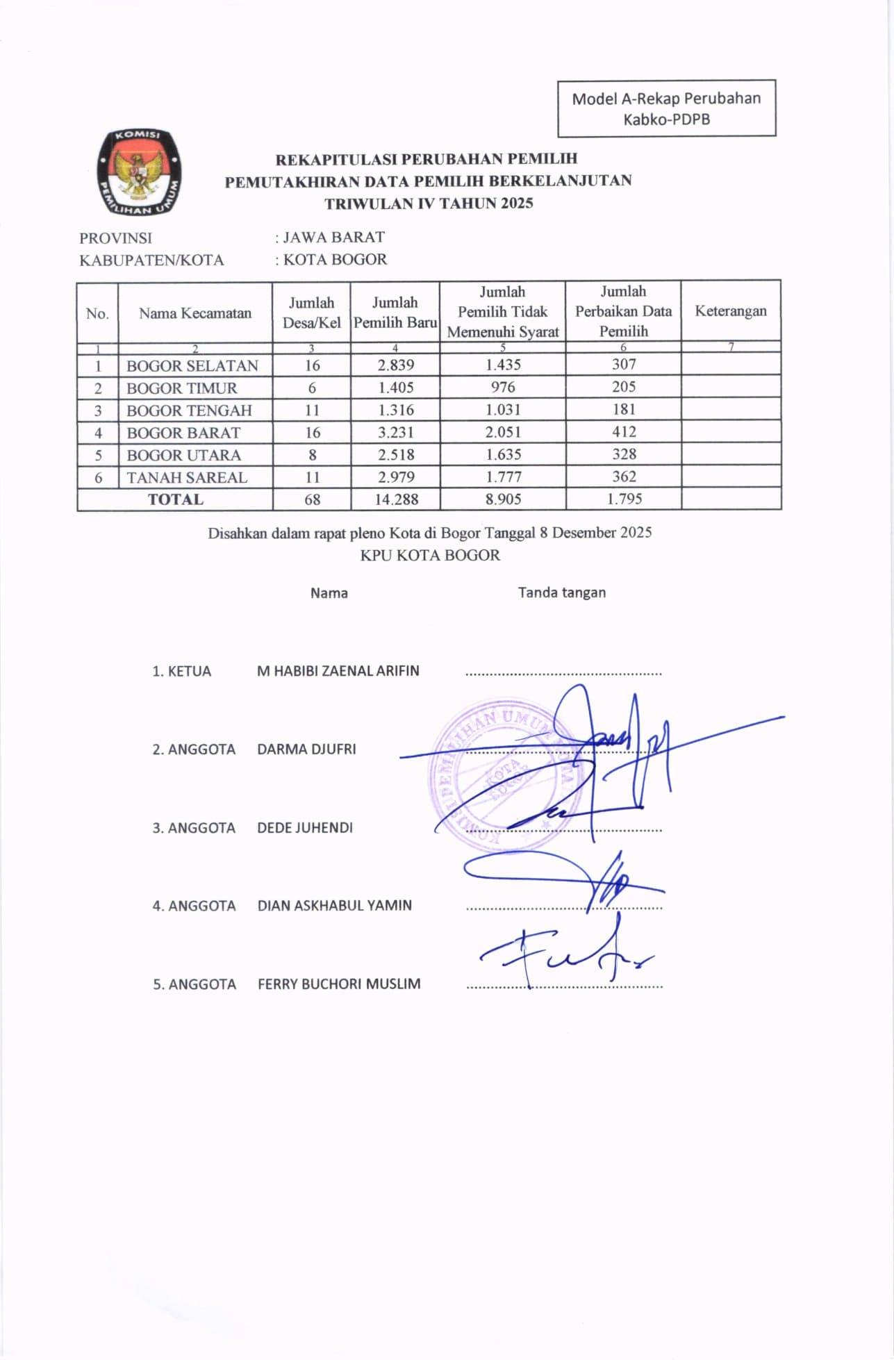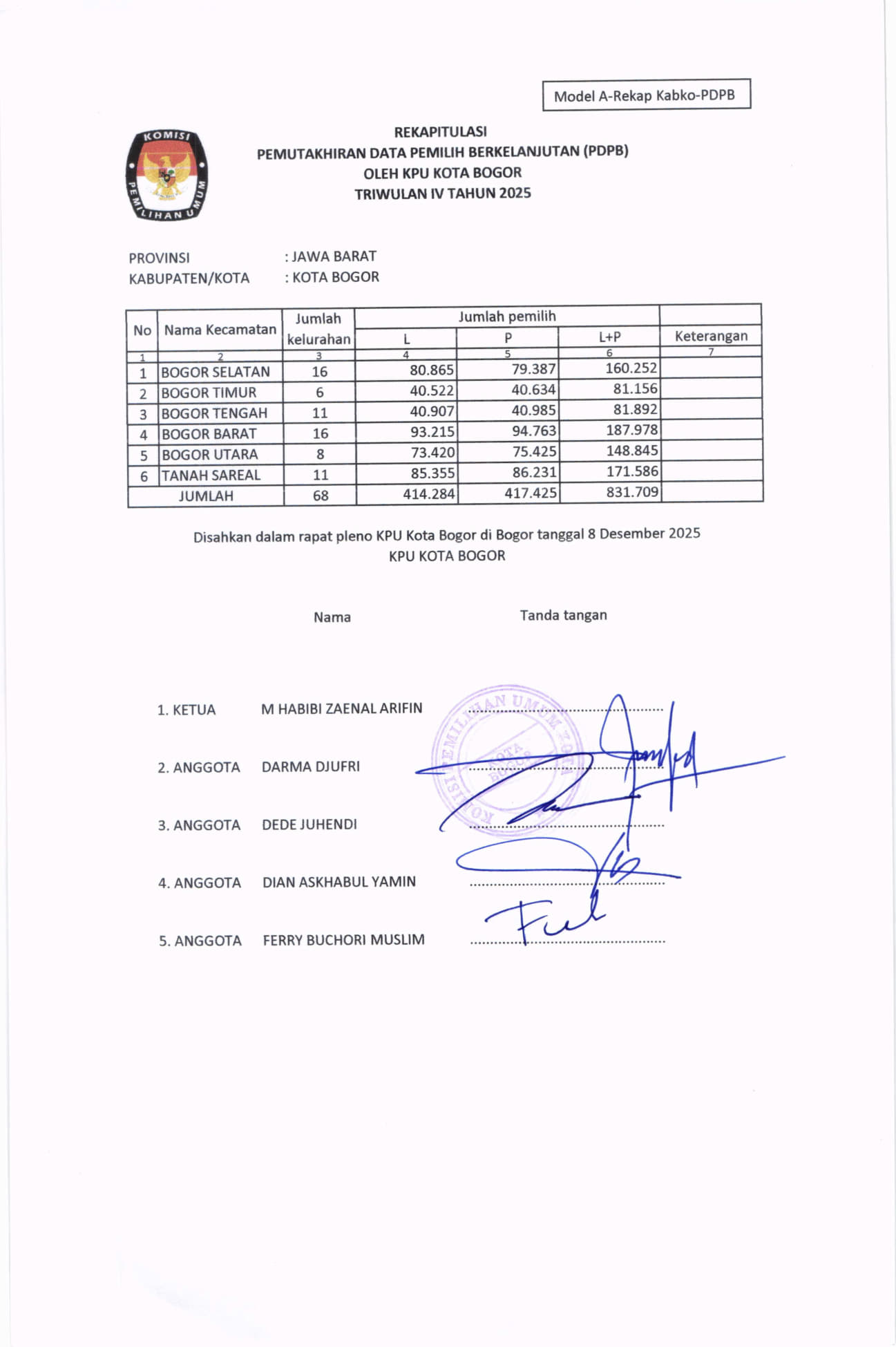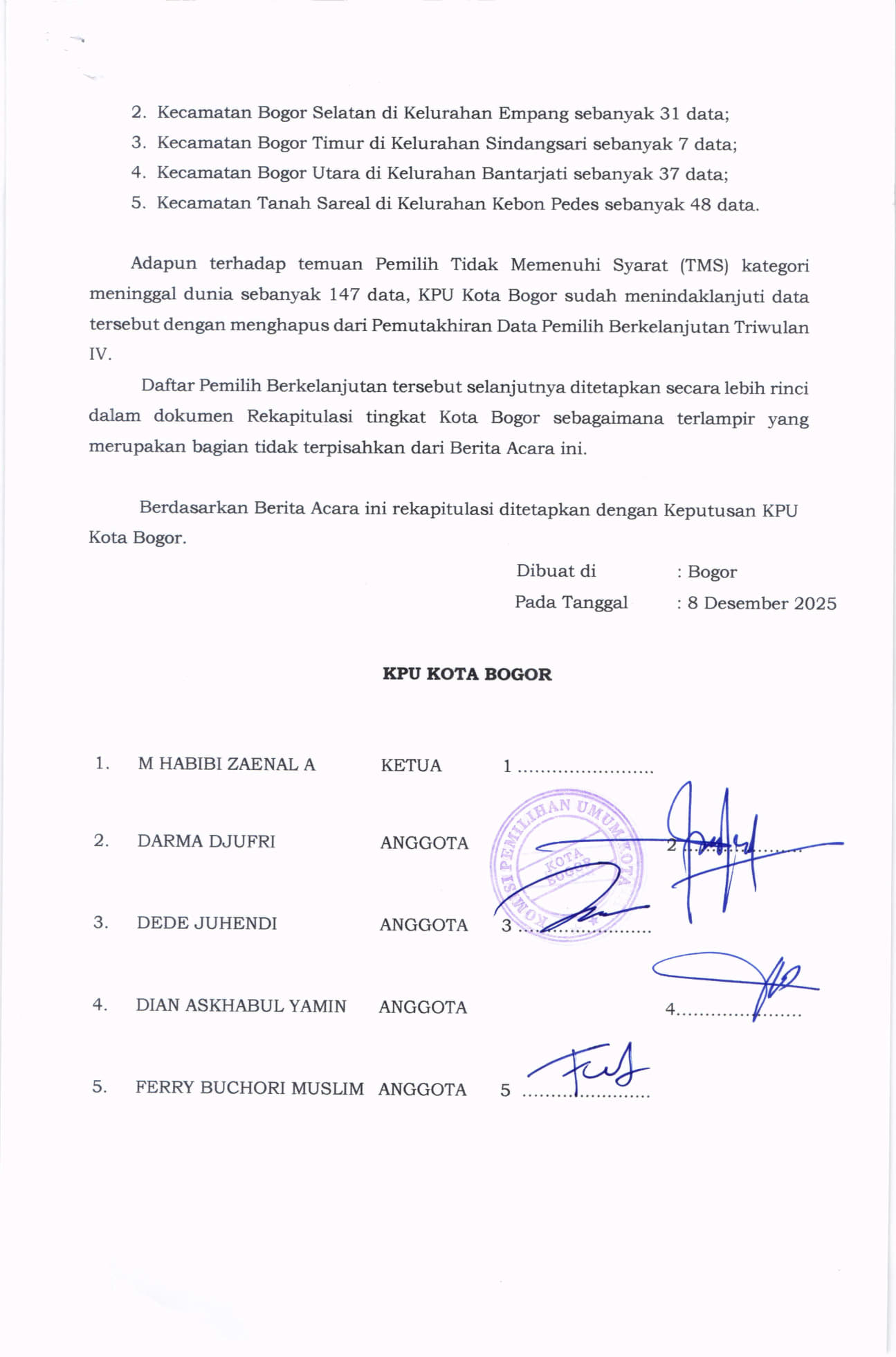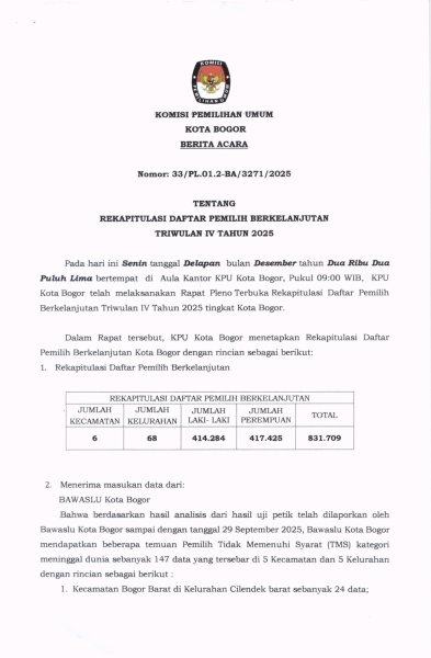 BERITA ACARA REKAPITULASI DAFTAR PEMILIH BERKELANJUTAN TRIWULAN IV TAHUN 2025 Senin, 08 Desember 2025 10:09 3 DOKUMEN DAPAT DIUNDUH DISINI! Bagikan: Telah dilihat 3 kali