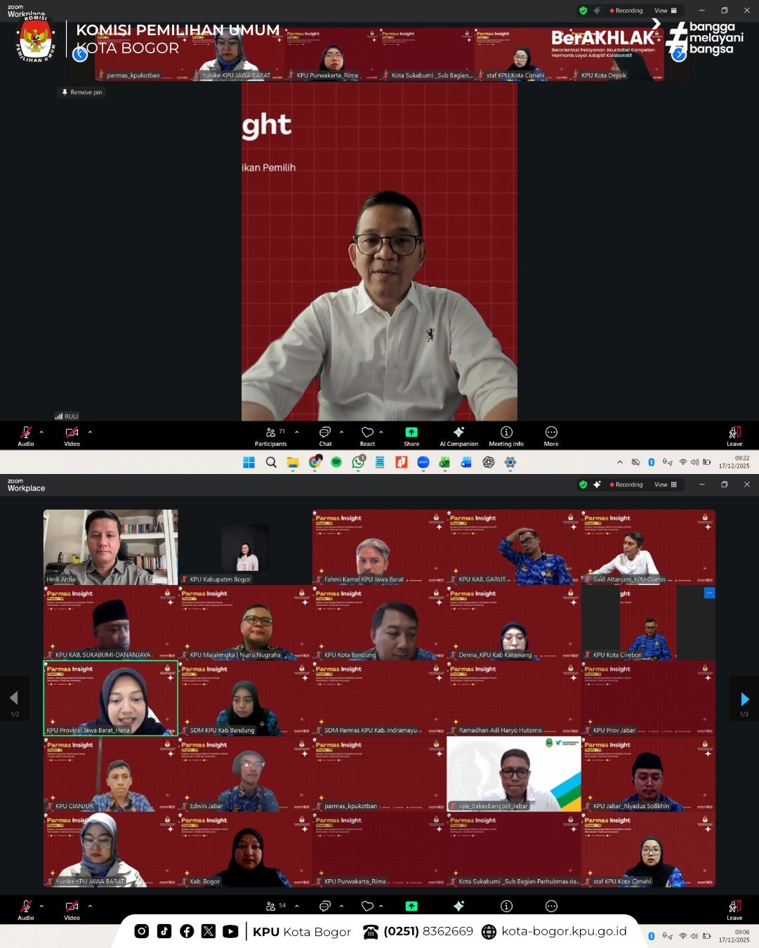 KOTA BOGOR –Ketua Divisi Parhumas dan SDM Darma Djufri, M.I.Kom, dan Kepala Sub Bagian Parhumas dan SDM Andhianna, S.IP, serta seluruh staf Divisi Parhumas dan SDM KPU Kota Bogor mengikuti kegiatan Parmas Insight Chapter #10 dengan tema “Budaya Lokal sebagai Medium Pendidikan Pemilih” (Memadukan Tradisi dan Demokrasi) yang diselenggarakan secara daring oleh KPU Provinsi Jawa Barat, Rabu (17/12/2025). Kegiatan dipandu oleh Kasubag Parhumas dan SDM KPU Kabupaten Sukabumi Dananjaya Pupaningrat, serta dibuka secara resmi oleh Ketua Divisi Parhumas KPU Provinsi Jawa Barat, Hedi Ardia, S.Pd.I., M.A.P. Hadir sebagai Keynote Speech Wahyu Mijaya selaku Kepala Badan Kesatuan Bangsa dan Politik Provinsi Jawa Barat.