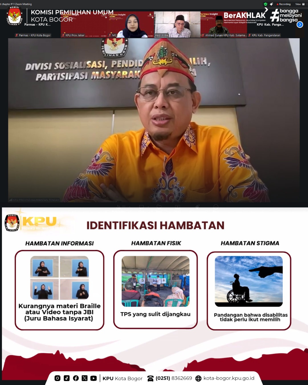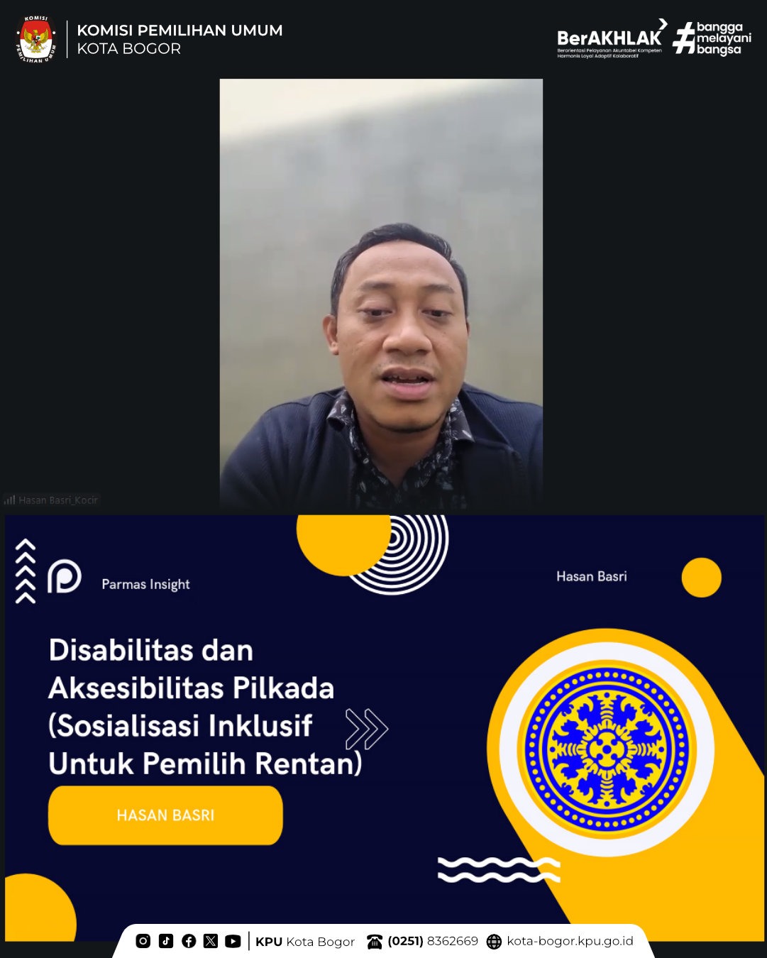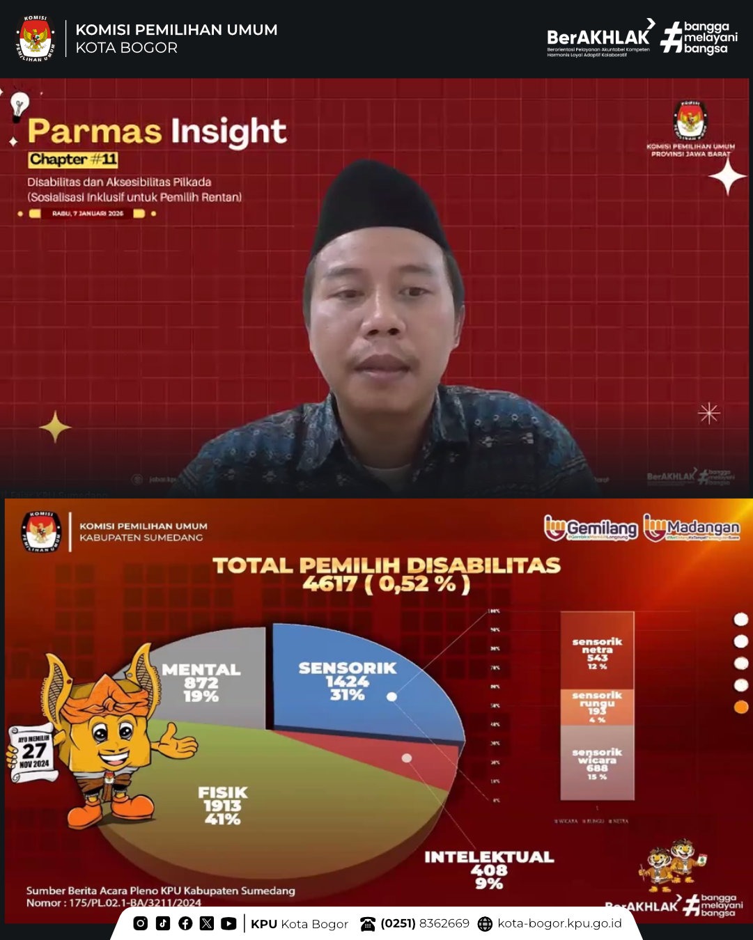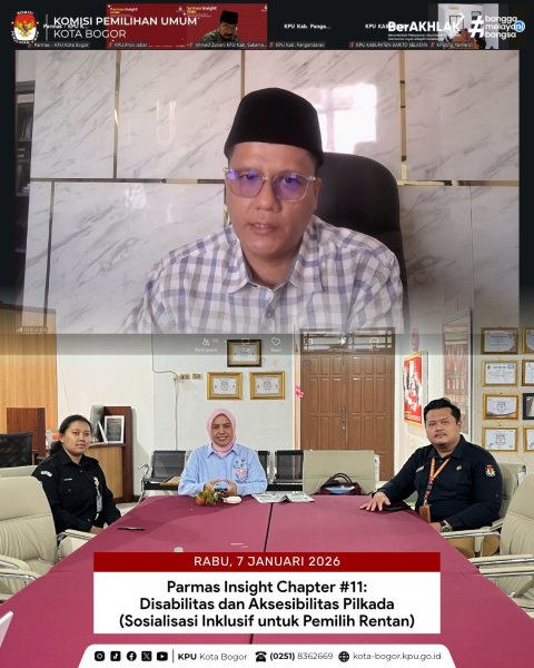 Kota Bogor - Pemilu dan Pilkada yang berkualitas harus menjamin akses yang setara bagi seluruh warga negara, termasuk penyandang disabilitas dan kelompok pemilih rentan. Komitmen tersebut menjadi tema utama dalam kegiatan Parmas Insight Chapter #11 yang diikuti oleh Ketua Divisi Sosialisasi, Pendidikan Pemilih, Partisipasi Masyarakat, dan SDM KPU Kota Bogor, Darma Jufri, M.I.Kom, beserta jajaran Subbag terkait pada Rabu, 7/01. .