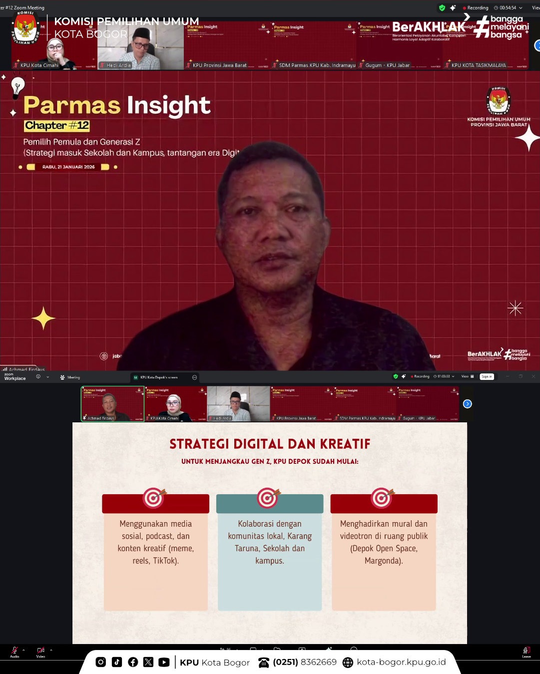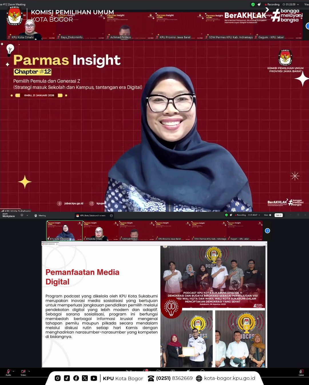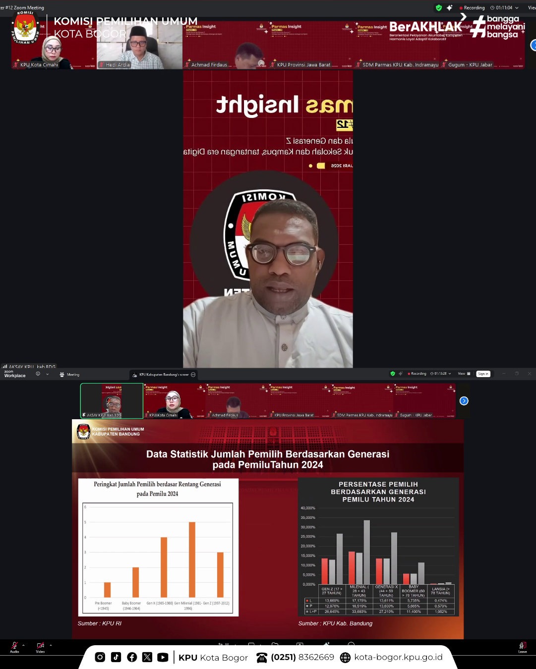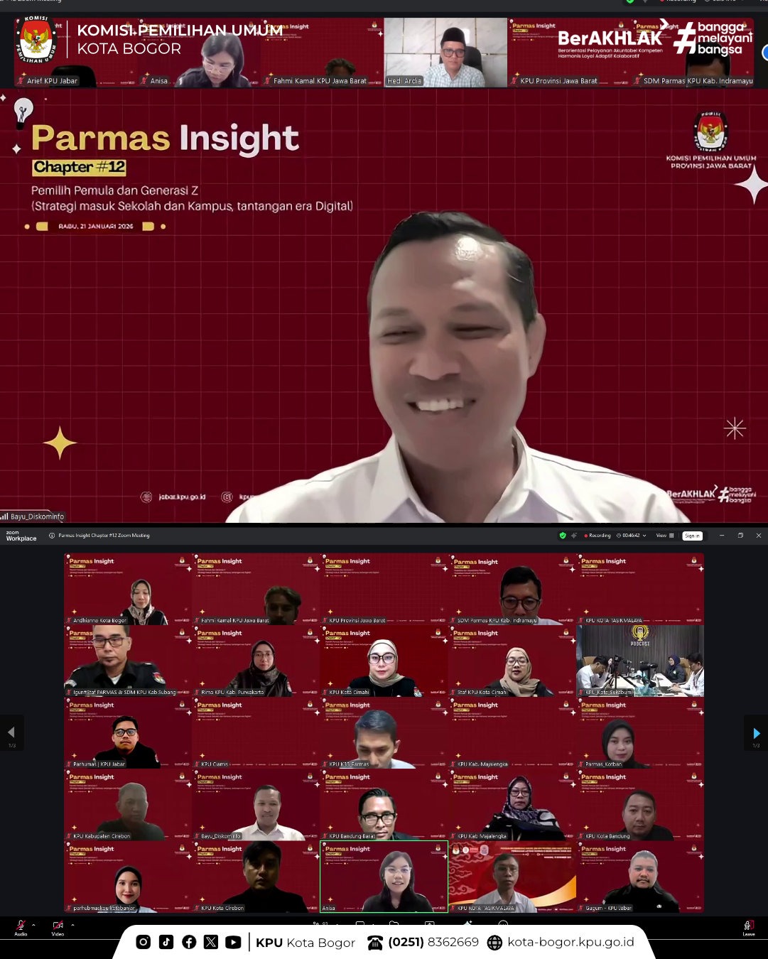 Kota Bogor – Divisi Sosdiklih Parhumas KPU Provinsi Jawa Barat menyelenggarakan Parmas Insight Chapter #12 yang merupakan periode terkahir dari program ini. Tema yang diambil kali ini adalah “Pemilih Pemula dan Generasi Z: Strategi Masuk Sekolah dan Kampus, Tantangan Era Digital”, pada Rabu, 21/01. Kegiatan ini dilaksanakan secara daring melalui Zoom Meeting.