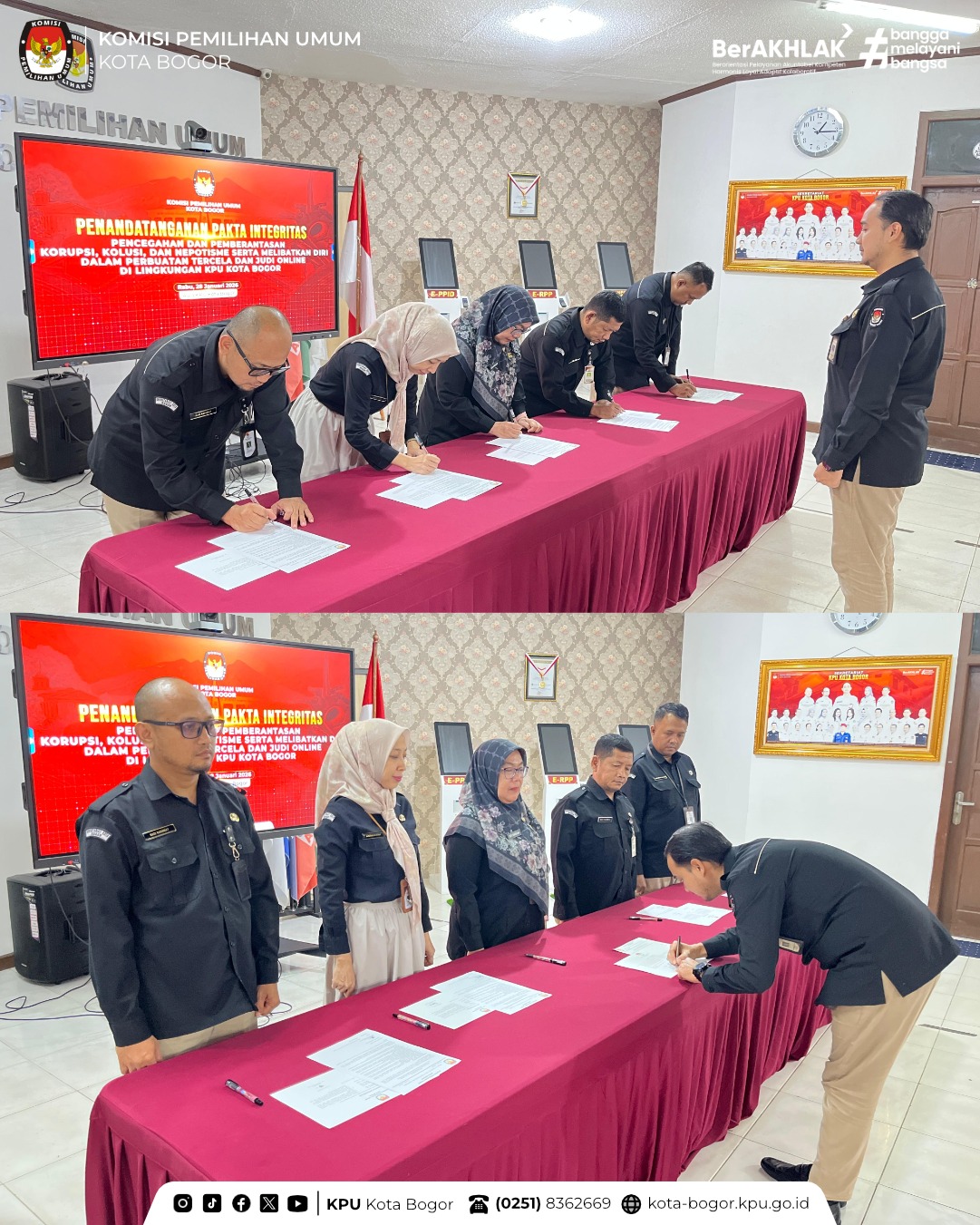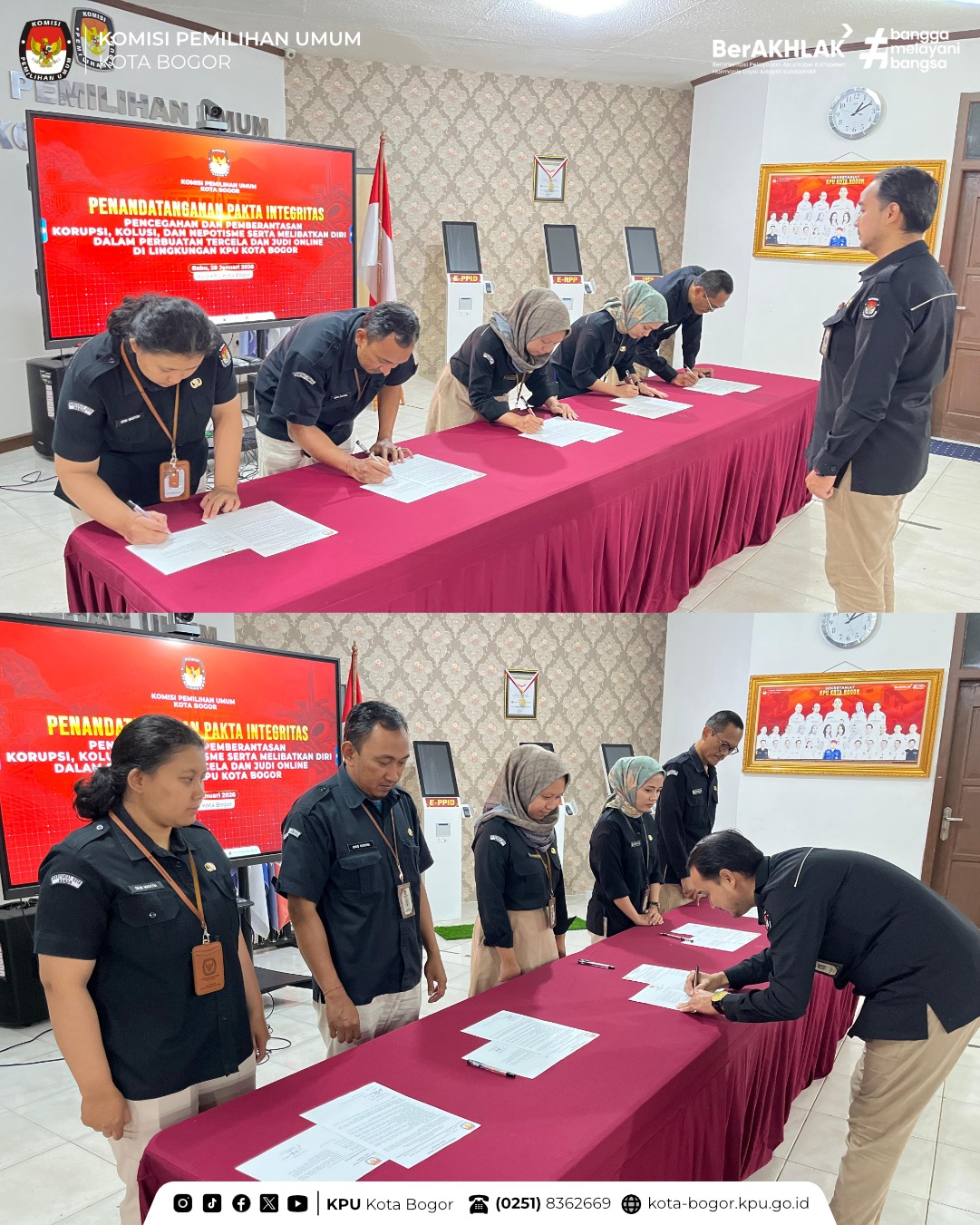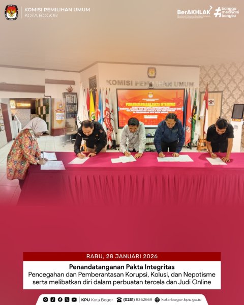 Kota Bogor — Menindaklanjuti kegiatan Pembinaan SDM yang diselenggarakan oleh KPU Provinsi Jawa Barat melalui zoom meeting Komisi Pemilihan Umum (KPU) Kota Bogor melaksanakan penandatanganan Pakta Integritas Pencegahan dan Pemberantasan Korupsi, Kolusi, dan Nepotisme (KKN), serta komitmen untuk tidak melibatkan diri dalam perbuatan tercela dan judi online, di lingkungan KPU Kota Bogor.
