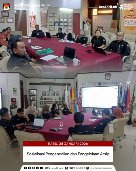 Kota Bogor — Komisi Pemilihan Umum (KPU) Kota Bogor menyelenggarakan Kegiatan Sosialisasi Pengendalian dan Pengelolaan Arsip pada Selasa, 28/01. Kegiatan ini merupakan bagian dari upaya peningkatan tata kelola administrasi dan kearsipan yang tertib, efektif, serta sesuai dengan ketentuan peraturan perundang-undangan.