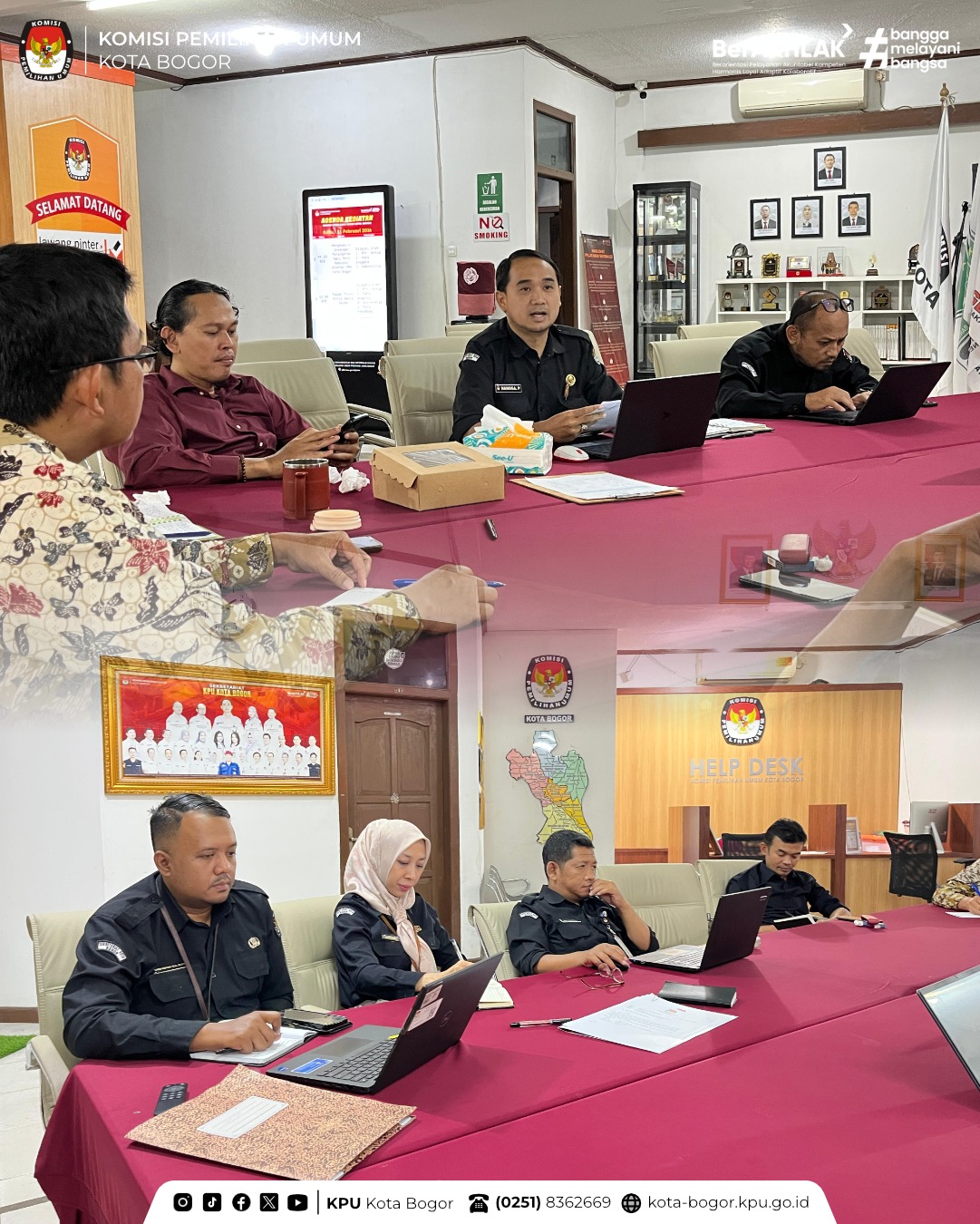 KOTA BOGOR – Komisi Pemilihan Umum (KPU) Kota Bogor melakasanakan Rapat Pleno Mingguan, Rabu, 11/02. Rapat yang dilaksanakan di Aula Kantor KPU Kota Bogor Jl. senam No. 12. Rapat diikuti oleh seluruh Anggota KPU dan jajaran Pimpinan sekretariat. Pembahasan rapat kali ini membahas perkembangan program kerja, evaluasi kegiatan pekan sebelumnya, serta rencana tindak lanjut untuk meningkatkan kualitas layanan kinerja .
