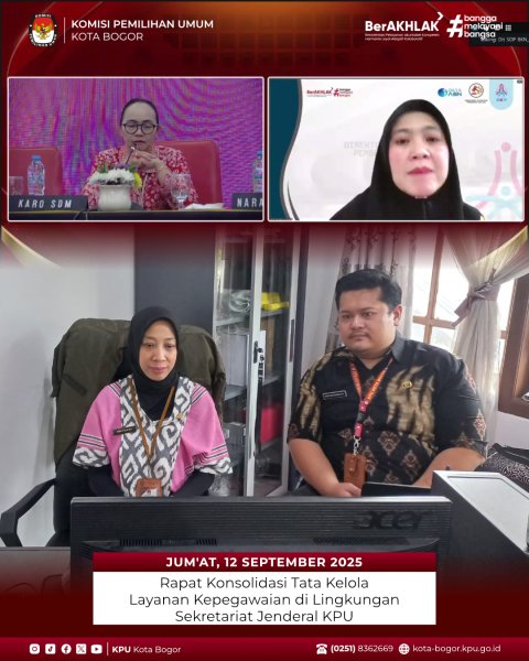 Pada hari Jumat, 12 September 2025, KPU Kota Bogor mengikuti kegiatan Rapat Konsolidasi Tata Layanan Kepegawaian bersama Badan Kepegawaian Negara (BKN) yang diselenggarakan di lingkungan Sekretariat Jenderal KPU RI. Kegiatan ini bertujuan untuk memperkuat tata kelola layanan kepegawaian di lingkungan KPU, mulai dari perencanaan kebutuhan ASN, pengadaan dan mutasi, hingga status dan pemberhentian ASN. Dengan adanya konsolidasi ini, diharapkan proses pelayanan kepegawaian semakin efektif, transparan, dan akuntabel, sehingga mendukung peningkatan kinerja kelembagaan KPU.