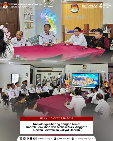 Bogor, 20 Oktober 2025 — Komisi Pemilihan Umum (KPU) Kota Bogor menggelar kegiatan Knowledge Sharing dengan tema “Daerah Pemilihan dan Alokasi Kursi Anggota Dewan Perwakilan Rakyat Daerah.”