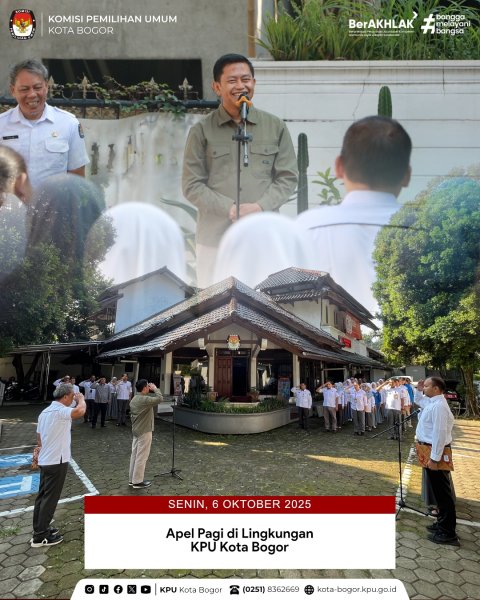 Senin pagi, jajaran KPU Kota Bogor melaksanakan apel rutin di halaman kantor. Ketua Divisi Hukum dan Pengawasan, Dede Juhendi, S.E., bertindak sebagai pembina apel.