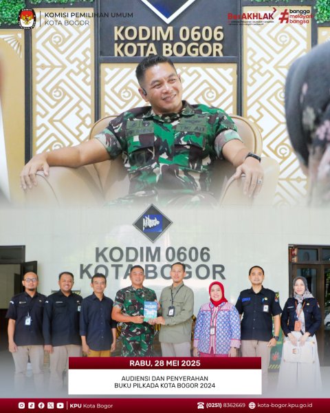 Rombongan KPU diterima secara langsung oleh Dandim 0606 Kota Bogor Kolonel Inf Dwi Agung Prihanto, S. Sos., M. tr (Han) di kantornya Jl. Jendral Sudirman No. 33, Bogor Tengah, Kota Bogor.