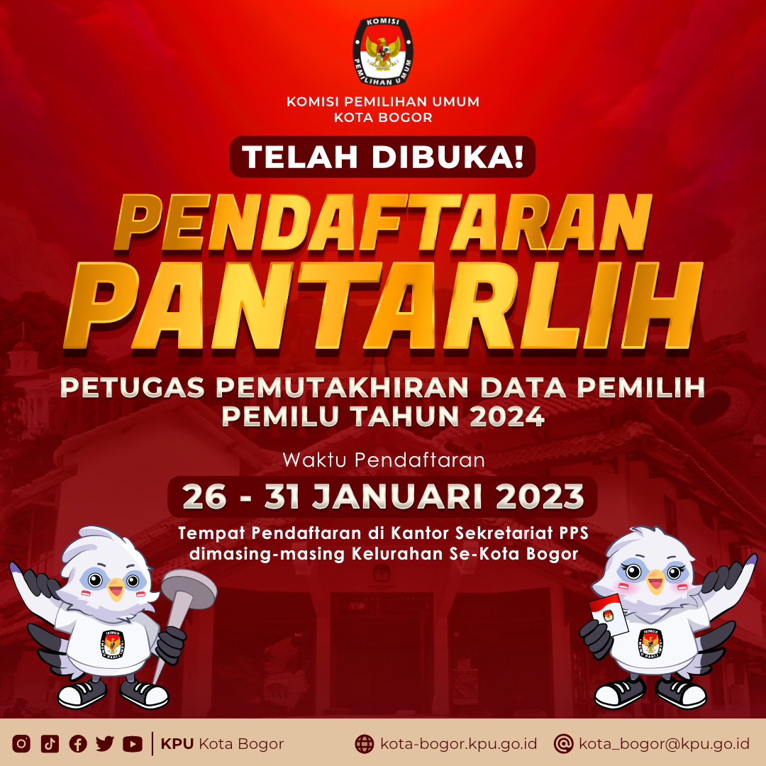 Hai #TemanPemilih, telah dibuka PENDAFTARAN PANTARLIH (Petugas Pemutakhiran Data Pemilih) untuk Pemilihan Umum Tahun 2024. Hayu bagi warga Kota Bogor yang berminat menjadi bagian dari Penyelenggara Pemilu dan berpartisipasi menyukseskan Pemilu Tahun SEGERA MENDAFTAR DI KANTOR SEKRETARIAT PPS yaitu DI MASING-MASING KELURAHAN. ?