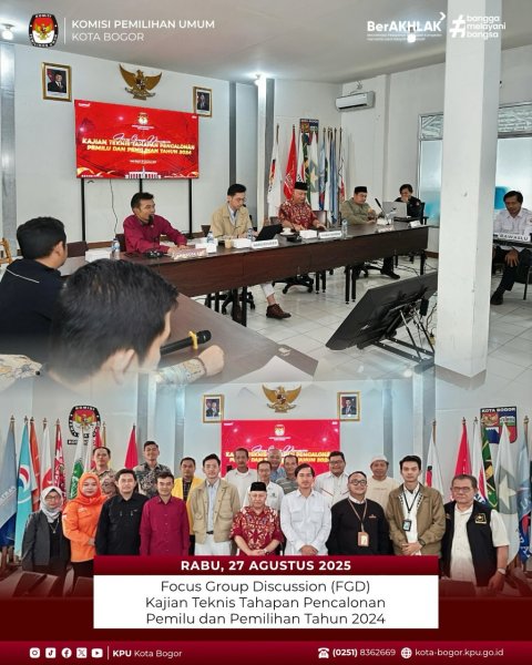 KPU Kota Bogor menyelenggarakan Focus Group Discussion (FGD) Kajian Teknis Tahapan Pencalonan pada Pemilu dan Pemilihan Tahun 2024. Kegiatan ini dibuka secara resmi oleh Ketua KPU Kota Bogor, Muhammad Habibi Zaenal Arifin, S.Pd.I., S.E., dan dimoderatori oleh Ketua Divisi Teknis Penyelenggaraan Pemilu, Dian Askhabul Yamin, S.P.