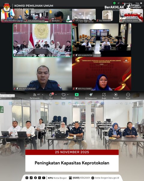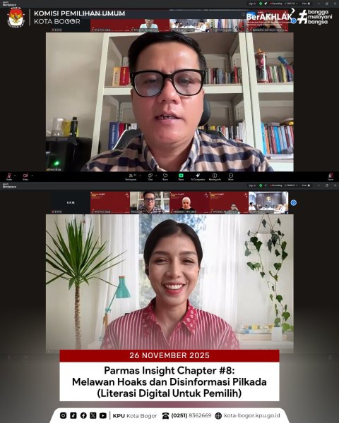 KOTA BOGOR – Komisi Pemilihan Umum (KPU) Kota Bogor mengikuti kegiatan Parmas Insight Chapter #8 melalui Zoom Meeting yang mengangkat tema “Melawan Hoaks dan Disinformasi Pilkada: Literasi Digital untuk Pemilih”, Rabu 26/11. Kegiatan dipandu oleh Kasubag Parhumas dan SDM KPU Kota Bogor, Mydita Puspa Ayu, S.H., M.H, serta dibuka secara resmi oleh Ketua Divisi Parhumas KPU Provinsi Jawa Barat, Hedi Ardia, S.Pd.I., M.A.P. Tema ini menjadi salah satu langkah strategis KPU dalam memperkuat pemahaman publik mengenai pentingnya informasi yang benar dan akurat pada tahapan Pemilu dan Pemilihan mendatang.
