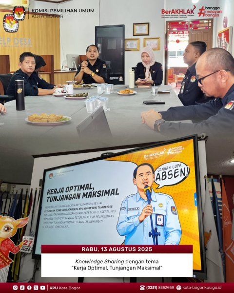 Dengan semangat meningkatkan pemahaman bersama, KPU Kota Bogor menggelar kegiatan Knowledge Sharing dengan tema “Kerja Optimal, Tunjangan Maksimal”. Kegiatan ini membahas seluk-beluk pemberian tunjangan kinerja pegawai KPU sesuai dengan Keputusan Sekretaris Jenderal KPU Nomor 1090 Tahun 2025 tentang perubahan atas Keputusan Sekretaris Jenderal KPU Nomor 326 Tahun 2022 mengenai petunjuk teknis pelaksanaan pemberian tunjangan kinerja di lingkungan Sekretariat Jenderal KPU.