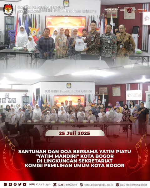 Acara yang dilangsungkan dalam suasana penuh kehangatan ini menghadirkan puluhan anak yatim dari lingkungan sekitar, disambut oleh jajaran KPU Kota Bogor dengan kasih sayang dan suka cita. Kegiatan ini menjadi bagian dari ikhtiar KPU untuk tidak hanya menjalankan tugas konstitusional sebagai penyelenggara Pemilu, tetapi juga hadir di tengah masyarakat dengan membawa semangat empati dan solidaritas. Acara ditutup dengan doa bersama, pembagian santunan.