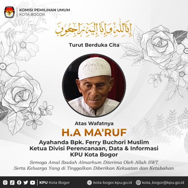 Keluarga besar Komisi Pemilihan Umum (KPU) Kota Bogor turut berduka cita yang mendalam atas wafatnya H. A. Ma’ruf Ayahanda tercinta dari Bapak Ferry Buchori Muslim Ketua Divisi Perencanaan, Data & Informasi