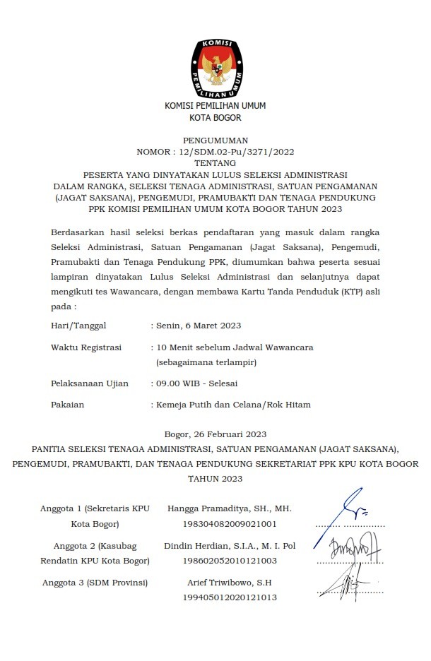 PENGUMUMAN TENTANG PESERTA YANG DINYATAKAN LULUS SELEKSI ADMINISTRASI KOMISI PEMILIHAN UMUM KOTA BOGOR TAHUN 2023 Kamis, 01 Januari 1970 07:00 892 Baca Selengkapnya