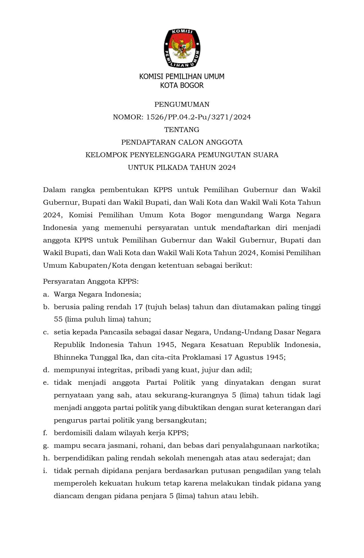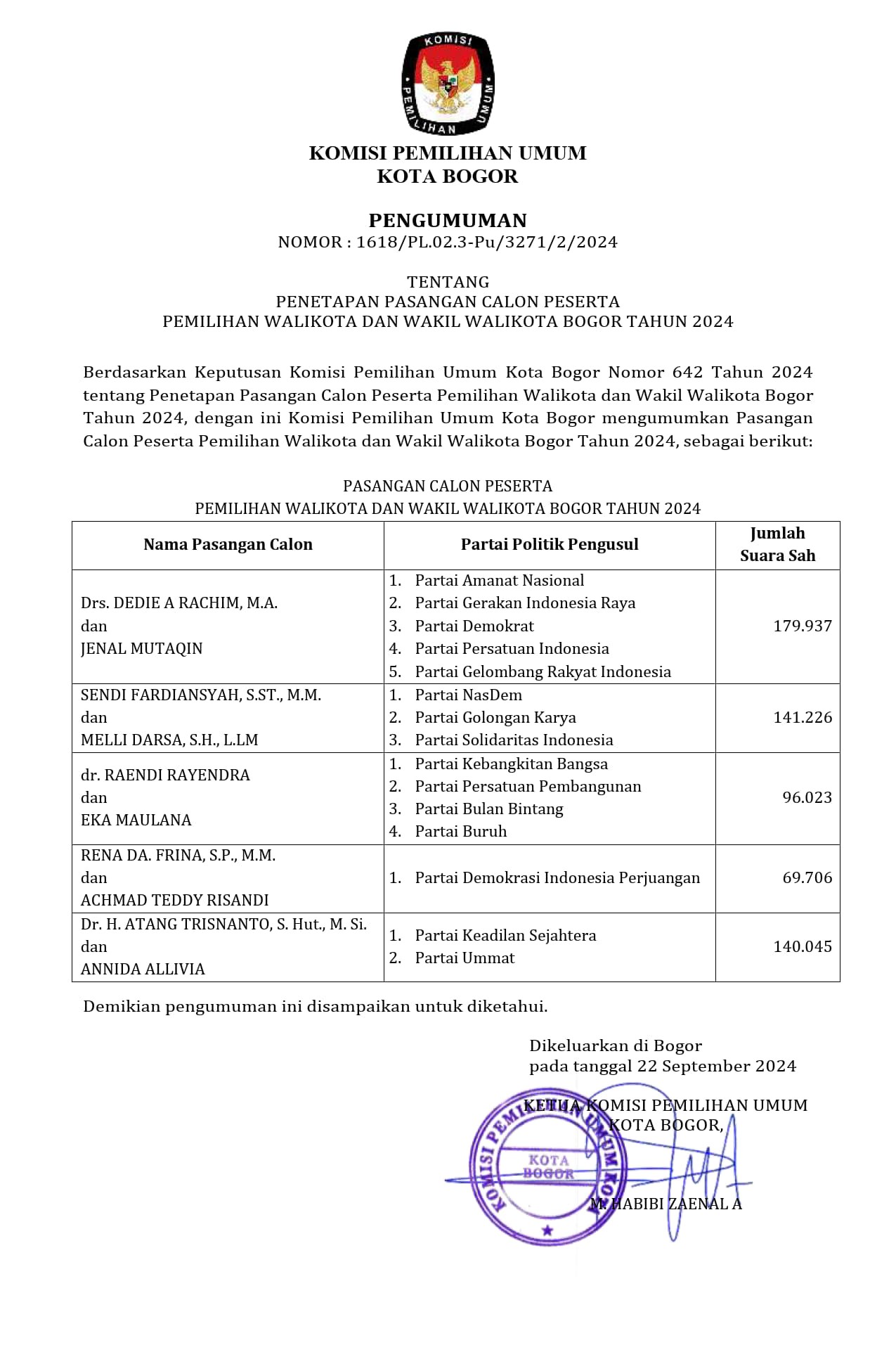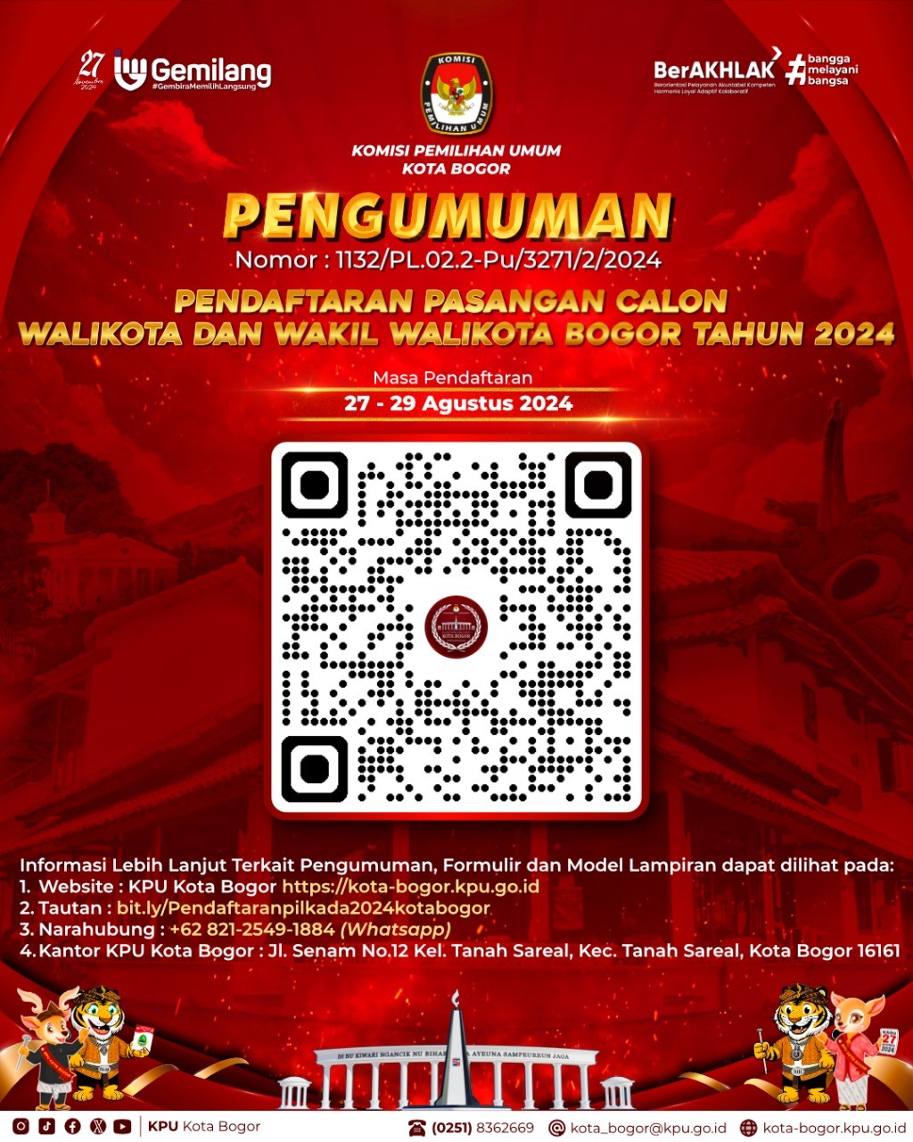 PENGUMUMAN PENDAFTARAN PASANGAN CALON WALIKOTA DAN WAKIL WALIKOTA BOGOR TAHUN 2024 Sabtu, 24 Agustus 2024 07:00 758 Dokumen dapat diunduh DISINI Baca Selengkapnya