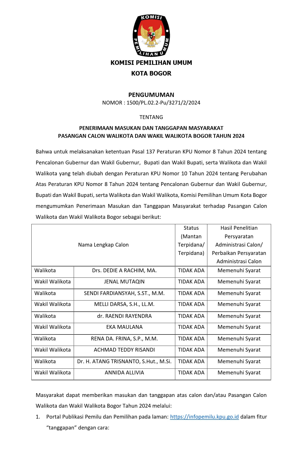 PENGUMUMAN PENERIMAAN MASUKAN DAN TANGGAPAN MASYARAKAT PASANGAN CALON WALIKOTA DAN WAKIL WALIKOTA BOGOR TAHUN 2024 Sabtu, 14 September 2024 07:00 688 Download dokumen DISINI Baca Selengkapnya