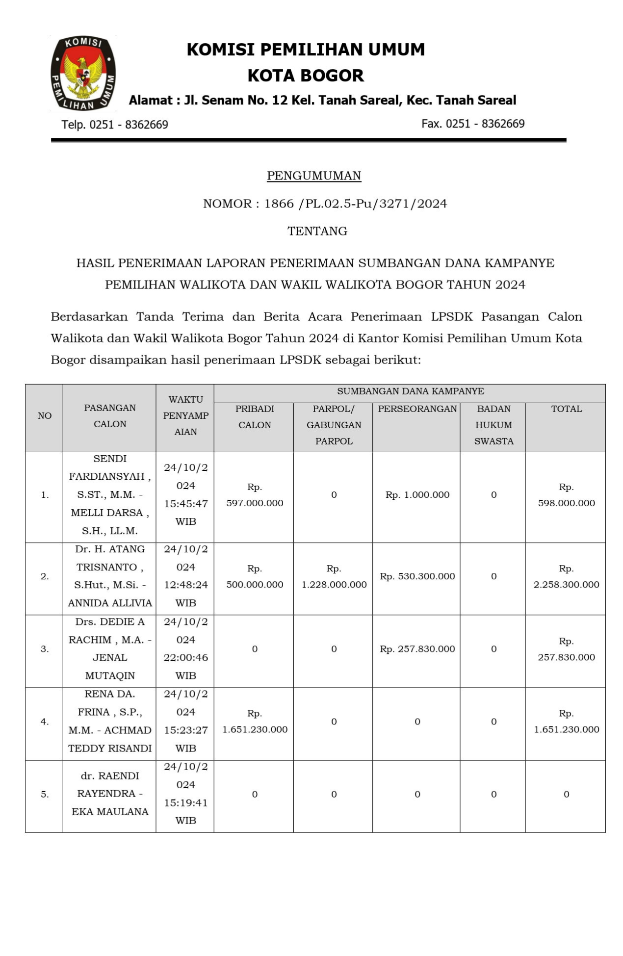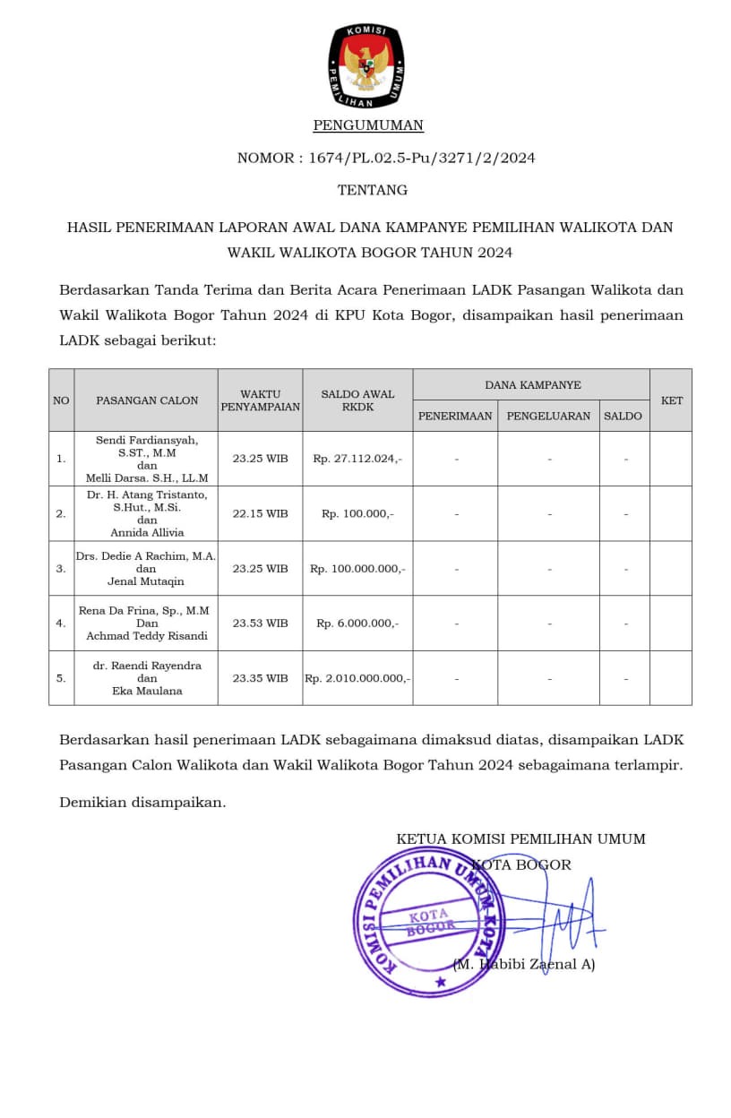 PENGUMUMAN HASIL PENERIMAAN LAPORAN AWAL DANA KAMPANYE PEMILIHAN WALIKOTA DAN WAKIL WALIKOTA BOGOR TAHUN 2024 Sabtu, 28 September 2024 07:00 746 Dokumen Pengumuman dapat diunduh DISINI Baca Selengkapnya