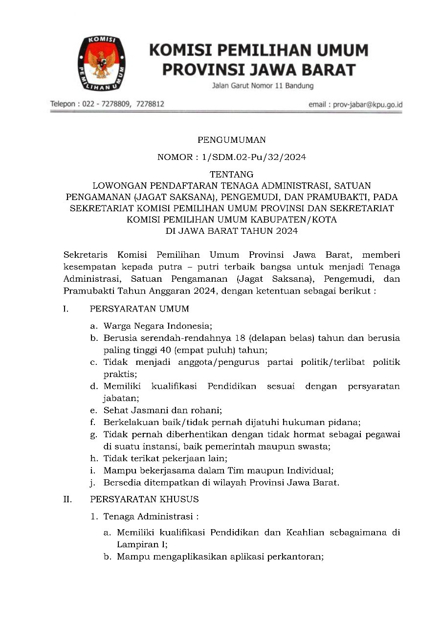 PENGUMUMAN NOMOR 4/SDM.02-Pu/32/2024 Selasa, 05 Maret 2024 07:00 704 Dokumen pengumuman dapat diunduh DISINI Baca Selengkapnya