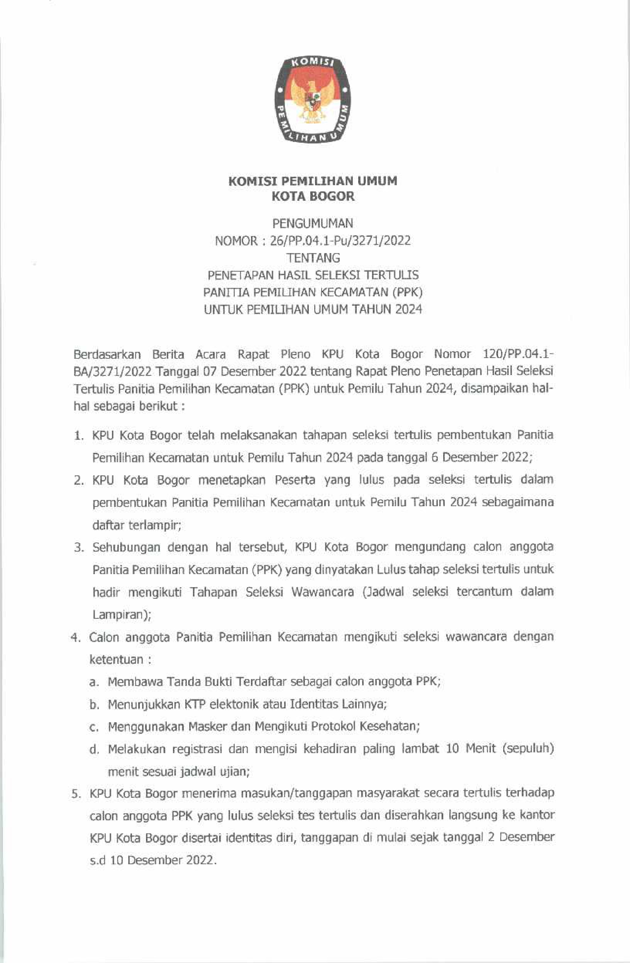 PENGUMUMAN PENETAPAN HASIL SELEKSI TERTULIS PANITIAN PEMILIHAN KECAMATAN (PPK) UNTUK PEMILIHAN UMUM TAHUN 2024 Kamis, 08 Desember 2022 07:00 790 Download file Pengumuman DISINI Baca Selengkapnya