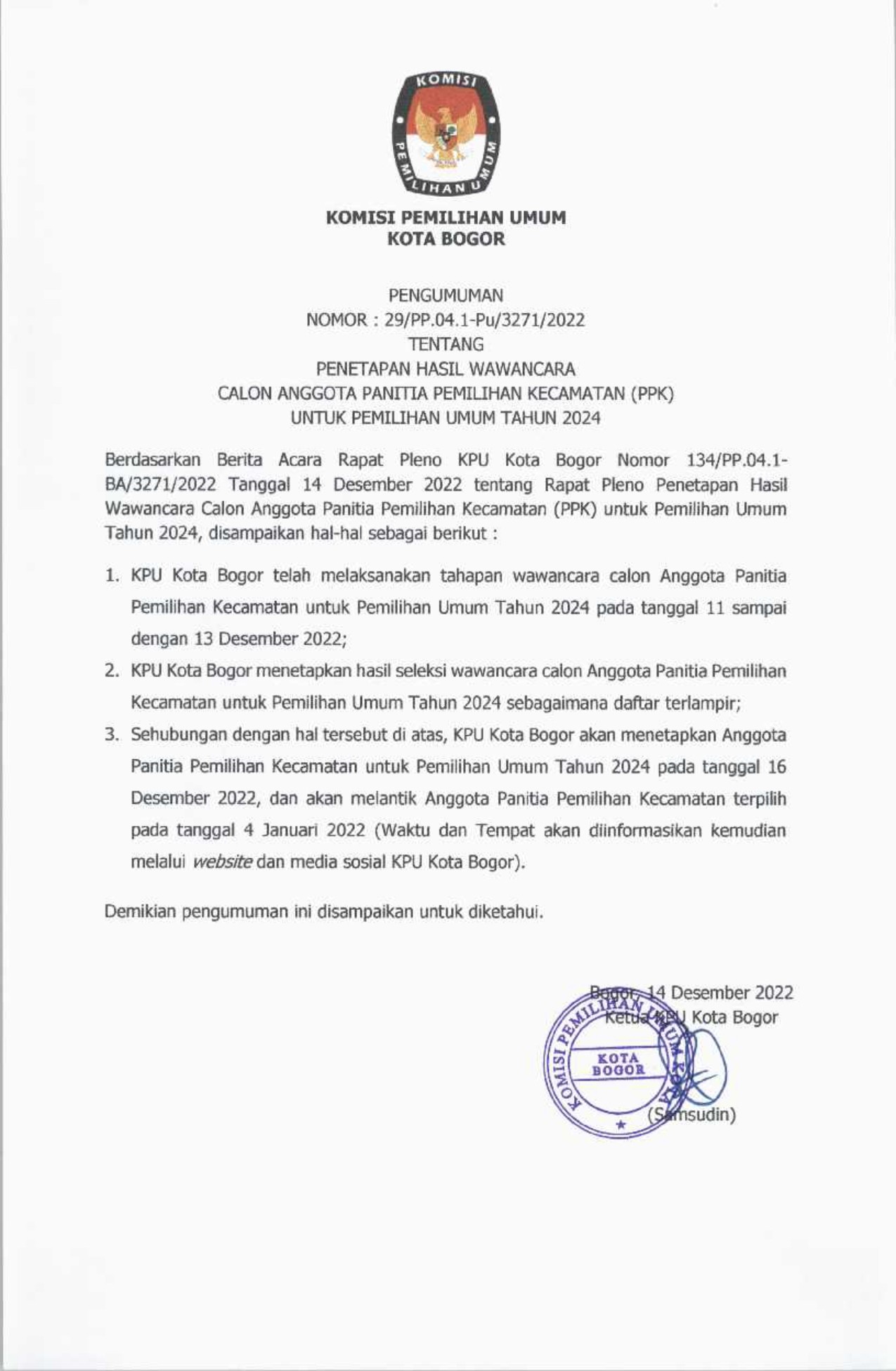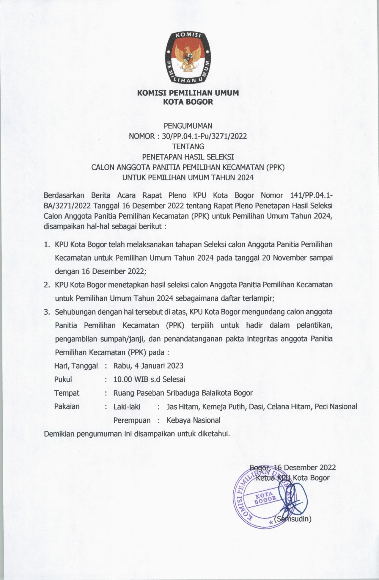 PENGUMUMAN HASIL SELEKSI CALON ANGGOTA PANITIA PEMILIHAN KECAMATAN (PPK) UNTUK PEMILIHAN UMUM TAHUN 2024 Jumat, 16 Desember 2022 07:00 934 Dokumen Pengumuman dapat di unduh DISINI Baca Selengkapnya