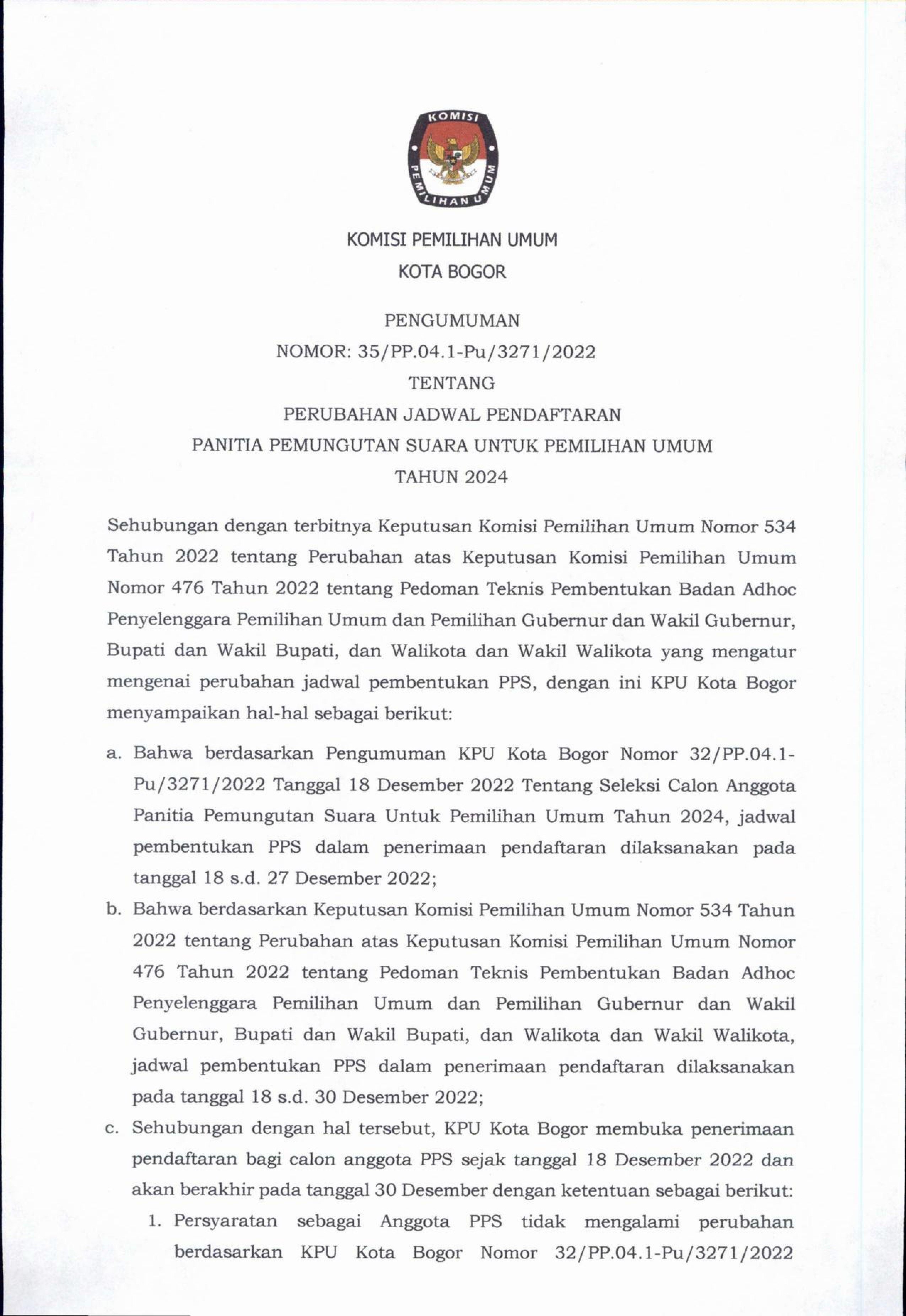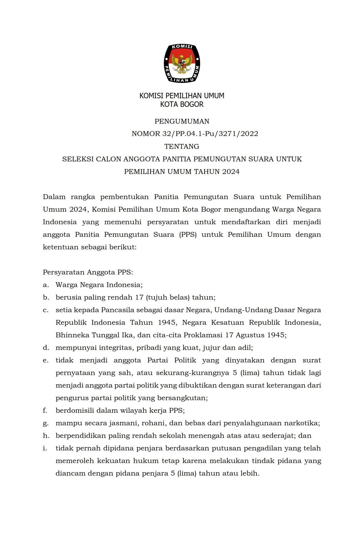 PENGUMUMAN NOMOR: 40/PP.04.1-Pu/3271/2022 TENTANG PERPANJANGAN PENDAFTARAN SELEKSI CALON ANGGOTA PANITIA PEMILIHAN SUARA (PPS) UNTUK PEMILU SERENTAK TAHUN 2024. Sabtu, 31 Desember 2022 07:00 892 Pengumuman dapat di unduh disini Baca Selengkapnya
